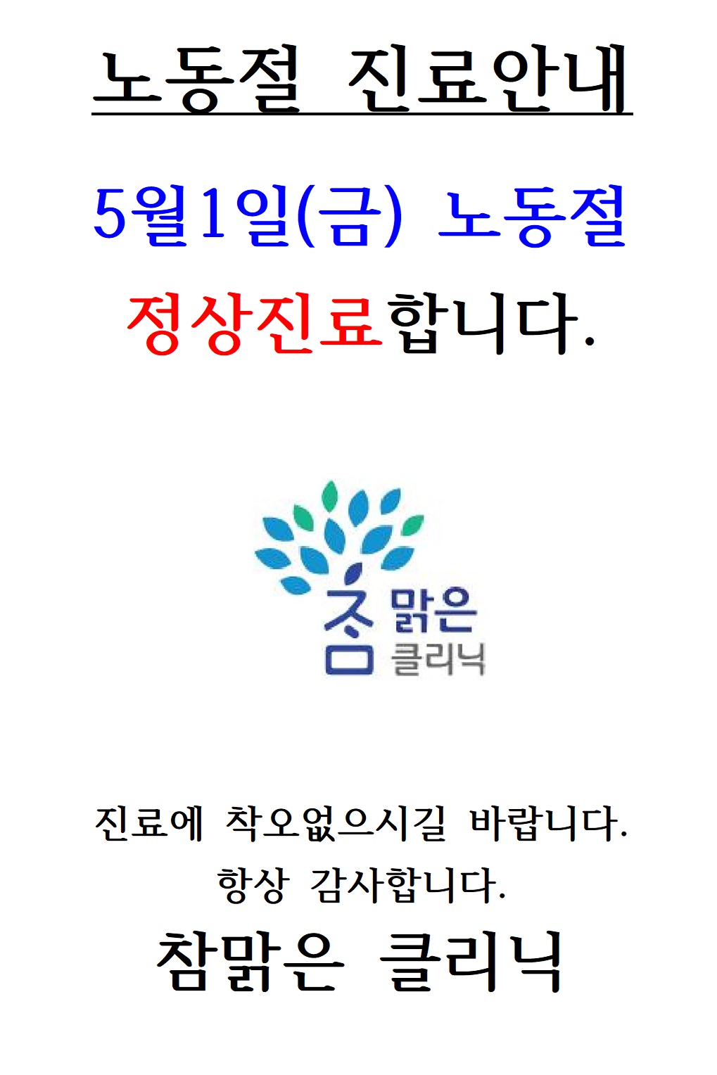 5/1(금) 노동절 정상진료합니다